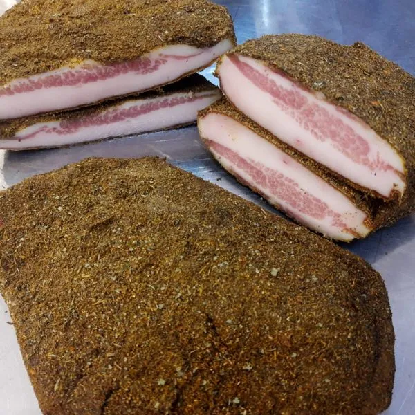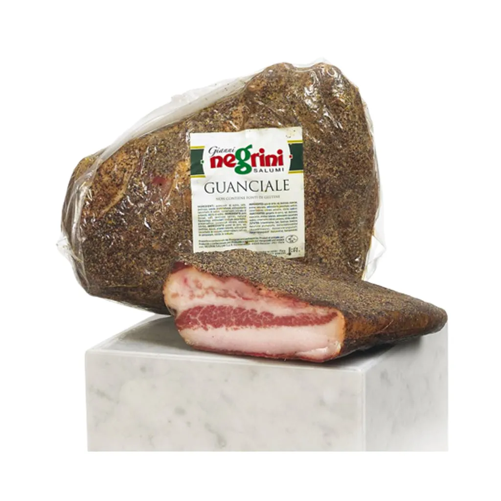 El Guanciale, producto de cerdo italiano, es muy apreciado en la gastronomía. Su sabor intenso y textura suave lo hacen ideal para platos como la carbonara. Su proceso de curado le otorga una consistencia dura y un sabor característico. ¡Prueba este ingrediente premium y disfruta de una experiencia culinaria inigualable!